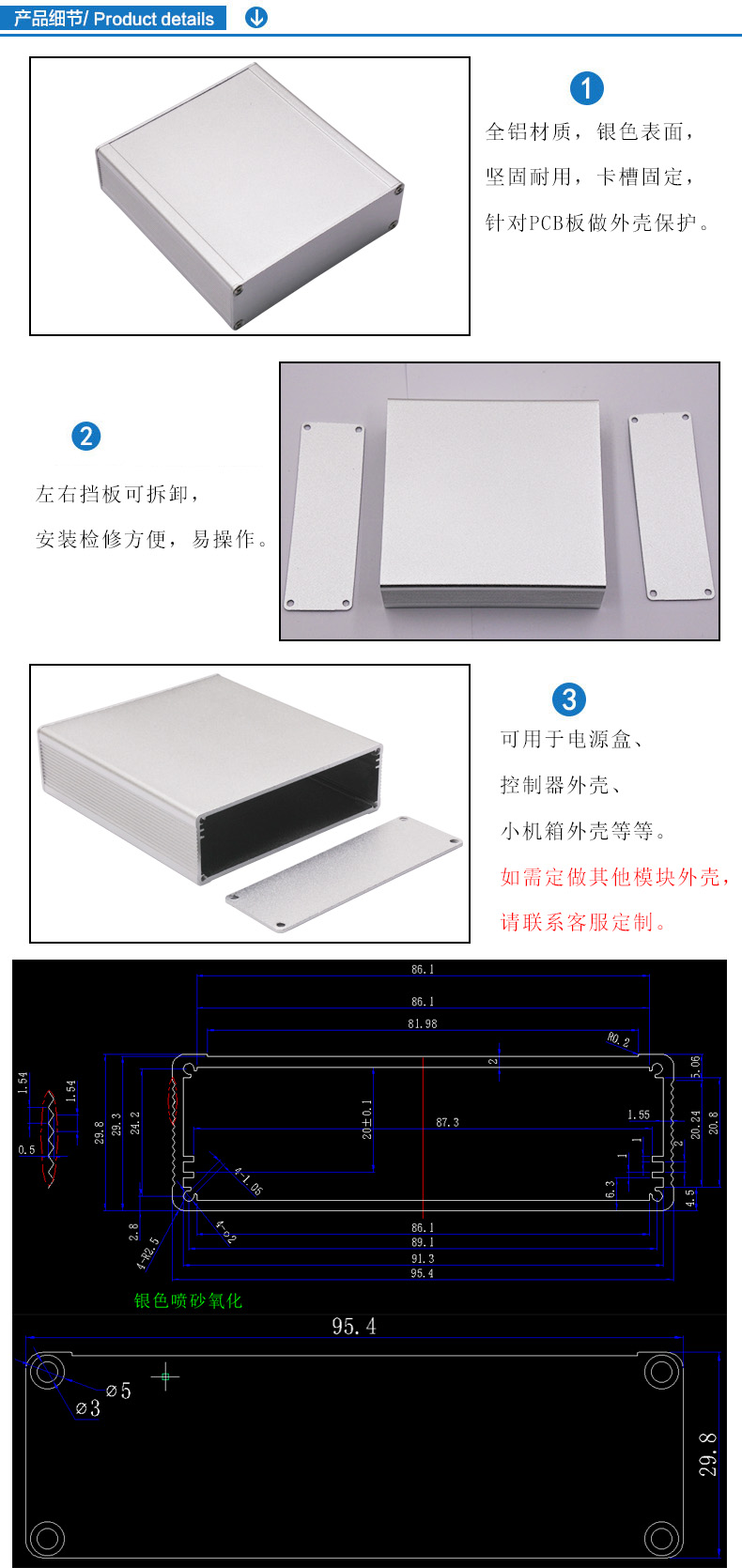 特點:1.全鋁材質(zhì),銀色表面,堅固耐用,卡槽固定,針對PCB板做外殼保護(hù)。