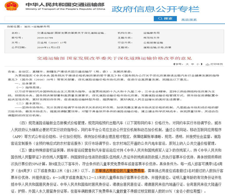 11月21日電(李金磊)交通運(yùn)輸部會(huì)同國(guó)家發(fā)改委21日印發(fā)《關(guān)于深化道路運(yùn)輸價(jià)格改革的意見(jiàn)》,明確符合條件的兒童乘坐客運(yùn)班車享受免費(fèi)乘車或者客票半價(jià)優(yōu)待。在兒童身高標(biāo)準(zhǔn)基礎(chǔ)上,增加以年齡為依據(jù)的兒童票、免票劃分標(biāo)準(zhǔn)。