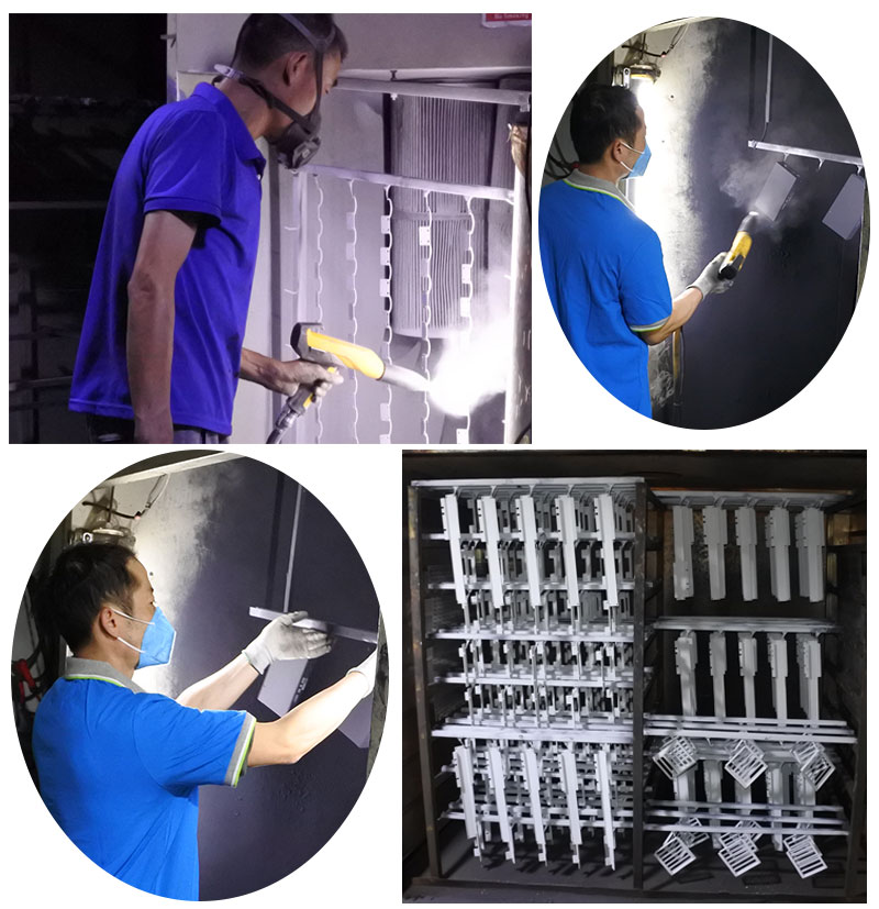 2、用靜電粉末噴涂機對產(chǎn)品進行粉末噴涂,在高壓靜電環(huán)境下,粉末帶負(fù)極性,粉末通過靜電噴涂槍,形成帶電粒子吸附在產(chǎn)品上。